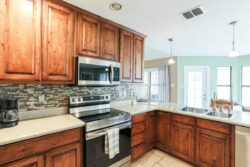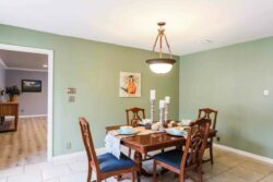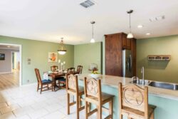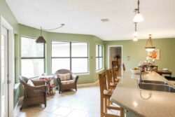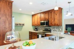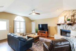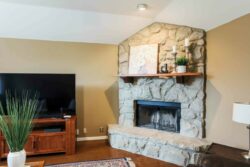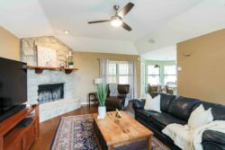 As you enter the front door, you’ll step inside to an inviting living room with a wood burning fireplace as well as wood flooring. The cool days in the winter make the fireplace the perfect place to grab a book and blanket and cozy up. The living room is partially open to the recently remodeled kitchen and dining area. This remodeled kitchen offers custom cabinetry, stainless appliances in addition to a bar area to pull up the bar stools.