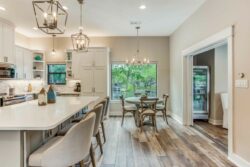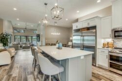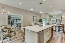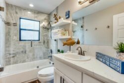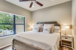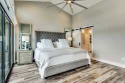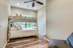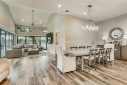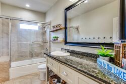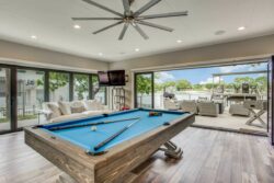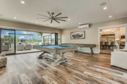 The open concept has spacious living areas that are open to the kitchen. In the kitchen, you’ll find stainless appliances, a large oversized refrigerator, and freezer, a built-in ice maker, a beverage refrigerator in addition to a double oven. Walk into the spacious game room complete with pool table/ping pong table, shuffleboard & commercial beverage refrigerator. Downstairs is the private primary bedroom with spa-like bathroom amenities including double vanities, a seamless glass walk-in shower, a large soaking tub as well a spacious closet. The secondary bedroom and 2 additional bathrooms are downstairs. Upstairs you’ll find 3 guest bedrooms and 2 bathrooms- perfect for your guests.