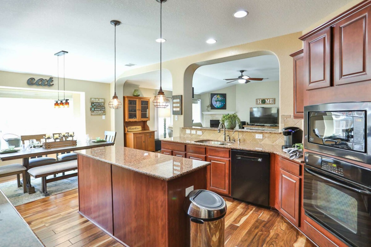 Dreams do come true! 12110 Presidio Pass is a darling home with an inground swimming pool, just in time for the summer! Step inside to a well-maintained and cared for home with wood flooring in most of the downstairs! You will love the open floorplan concept as well as a cozy fireplace. The spacious kitchen has an island that is wonderful for prep, built-in appliances, granite countertops in addition to plenty of cabinetry for storage. Both bedrooms, as well as the study, are downstairs. Upstairs you will find the game room and a full bathroom, making this a 1.5 story home! The master bedroom is split from the other rooms and the master bathroom features a separate tub/shower as well as a double vanity.